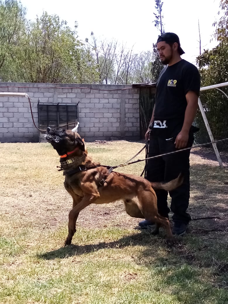 Perro K9 entrenado: responde únicamente a las órdenes del guía, actúa bajo control y combina obediencia avanzada con técnicas de protección profesional.